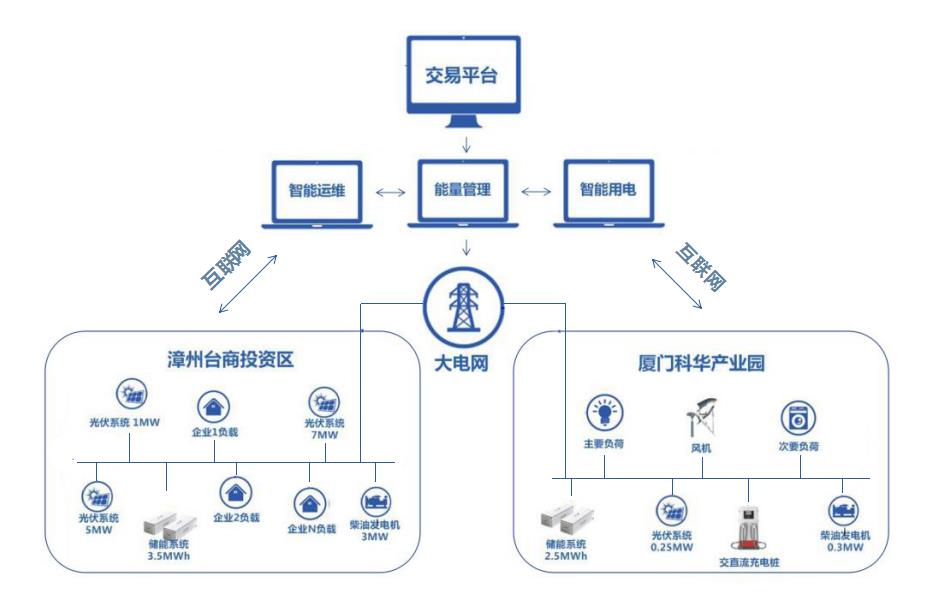 该项目的建设内容(如下图)包括建设光伏发电系统、微网储能系统、新能源汽车充电系统等能源互联网基础设施;建立能量管理、智能运维、智能用电三个平台,保证能源系统的高效可靠运行管理;建设能源互联网绿色能源灵活交易平台,开展售电业务,实现各种能源交易和结算。